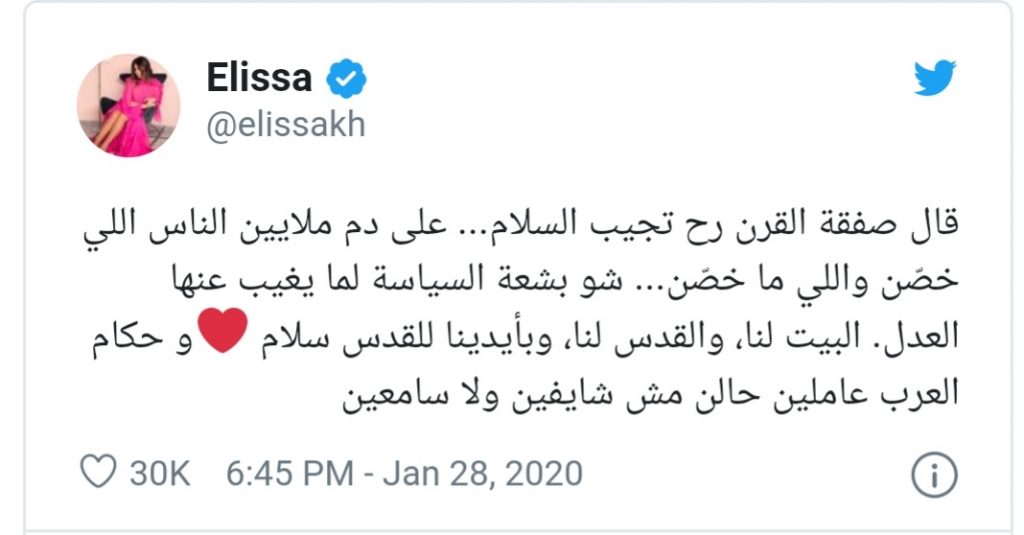 وغرّدت إليسا عبر حسابها بموقع “تويتر”: “قال صفقة القرن رح تجيب السلام.. على دم ملايين الناس اللي خصّن واللي ما خصّن.. شو بشعة السياسة لما يغيب عنها العدل”.
