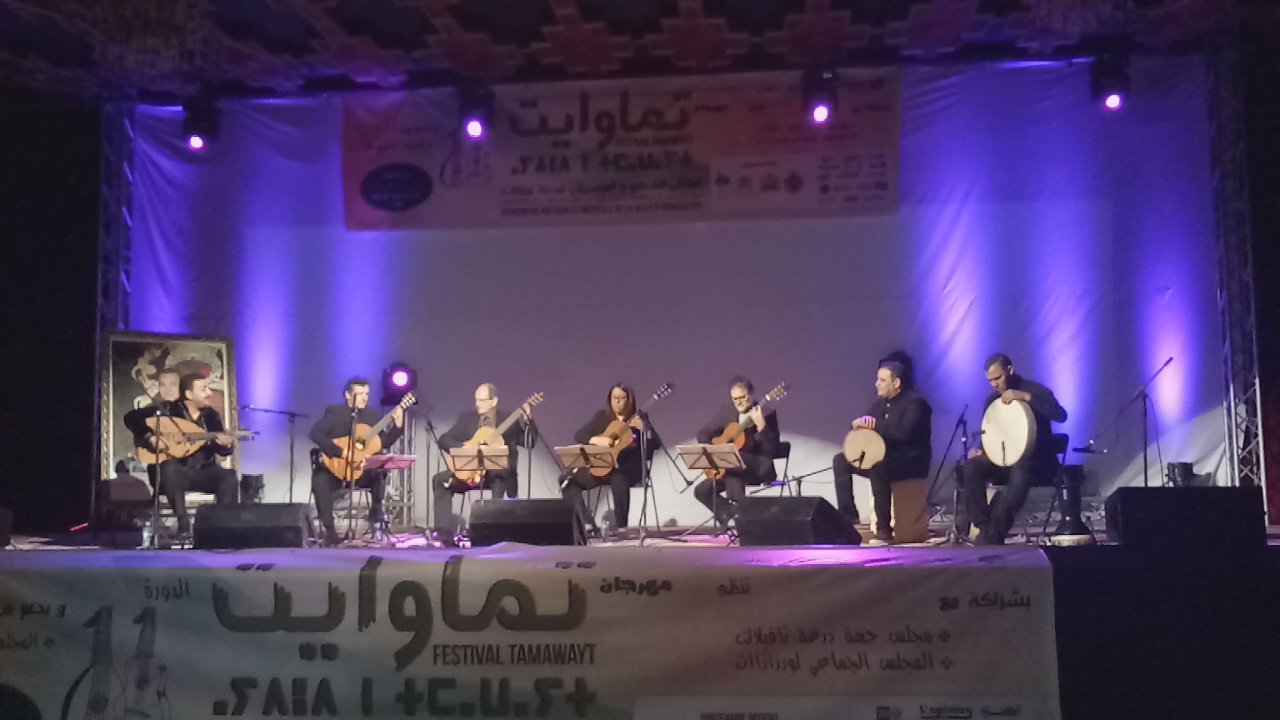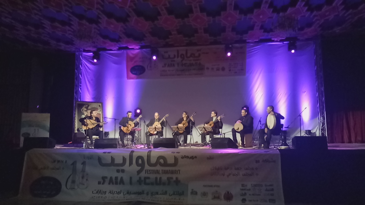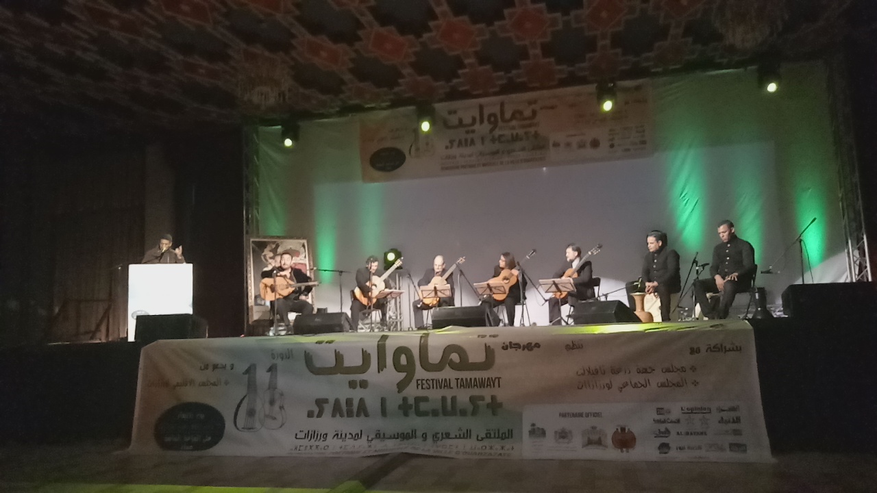 أسدل الستار بورزازات على فعاليات الدورة الحادية عشر للمهرجان الدولي للشعر والموسيقى تماوايت بأمسية موسيقية شعرية جلبت إليها جمهورا وفيا للمهرجان من مدينة ورزازات ومن خارجها استمتع بفقرات موسيقية وشعرية متفردة، حيث افتتحت الأمسية بقراءة شعرية أمازيغية لمحمد الزيادي من الجنوب الشرقي، صاحب ديوان تلكيت، ألقى قصائد ” تطفي نووسان”، ” أمودو” و ” أمزروي “، ليلتقي الجمهور مع اكتشاف موسيقي جديد حملته هذه الدورة ويتعلق الأمر برباعي القيثارة الإسباني ” بين أربعة ENTREQUATRE ” التي أدت معزوفات من موسيقى أمريكا اللاتينية منها معزوفة أرجنتينية وأخرى من الأوروغواي تحت عنوان ” بريسطا”، لتتواصل الأمسية بقراءة شعرية للزجال الورزازي عبد العزيز المكي الناصري الجمهور الذي أدى قصائد من ديوانه ” كهف النسور”.