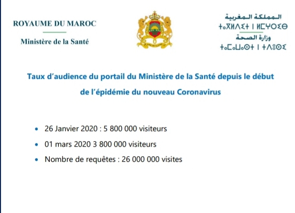 وأفادت أن معدل جمهور بوابة وزارة الصحة من البداية من وباء فيروس كورونا الجديد 26 يناير ، 2020، وصل الى 5،800،000 زائرا ، وفي فاتح مارس 2020، بلغ عدد الزوار الى 3،800،000 زائرا، كما سجل الموقع الرسمي للوزاة تسجيل عدد الطلبات وصال الى 26.000.000 زيارة.