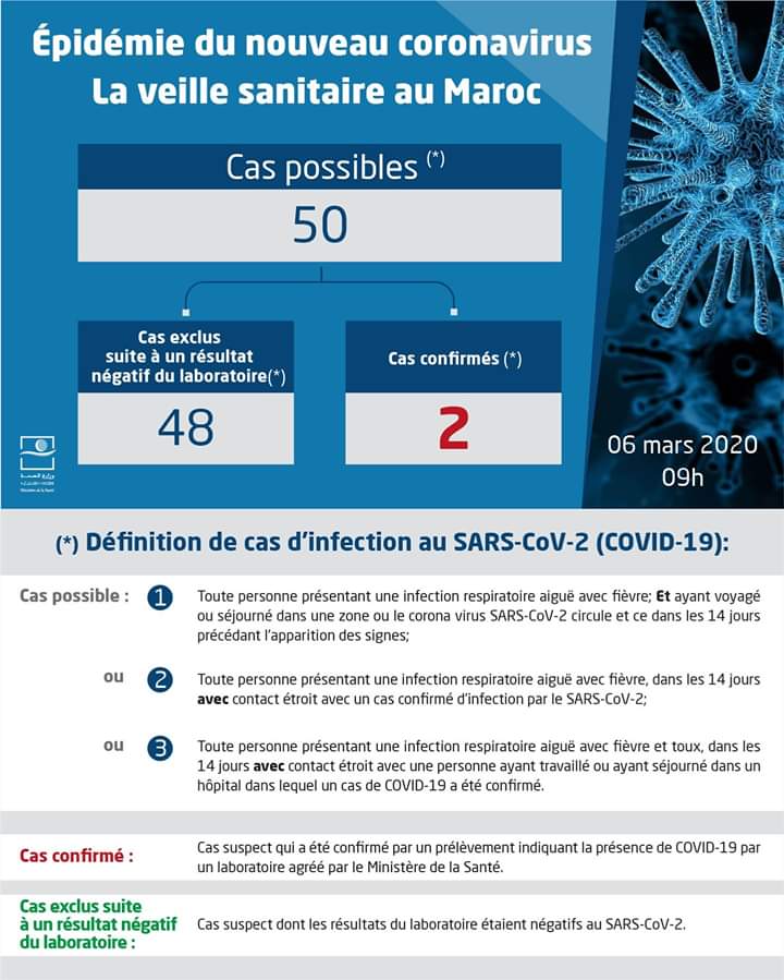 نشرت وزارة الصحة المغربية، معطيات رقمية حول فيروس كورونا ، وأوضحت في منشور عبر صفحاتها الرسمية على مواقع التواصل الاجتماعي وموقعها الالكتروني، الجمعة 06 مارس الجاري، أن تم تحليل مخبري ل 50 حالة محتملة، استبعدت 48 حالة بعد إجراء تحليل مخبري سلبي، فيما تم تسجيل حالتين مؤكدتين لمواطنين مغربيين عائدين من الديار الايطالية، ويخضعان للحجر الصحي تحت المراقبة الطبية.