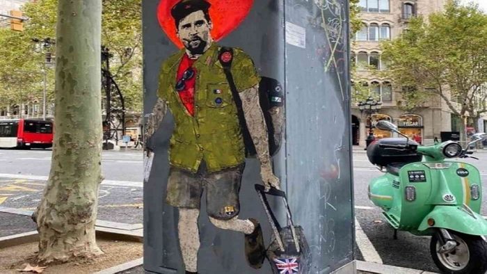 رسم الفنان المعروف باسم “تي في بوي”، لاعب كرة القدم الأرجنتيني ليونيل ميسي بزي تشي غيفارا على صندوق توصيلات كهربائية في ساحة كاتالونيا بمدينة برشلونة الإسبانية.