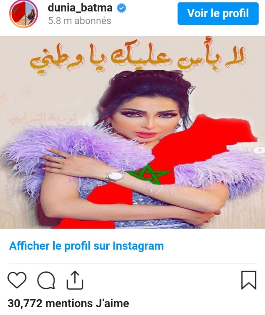 وظهرت بطمة في الصورة وهي تحضن خريطة المغرب وعلقت على الصورة بعبارة: “لاباس عليك يا وطني”.